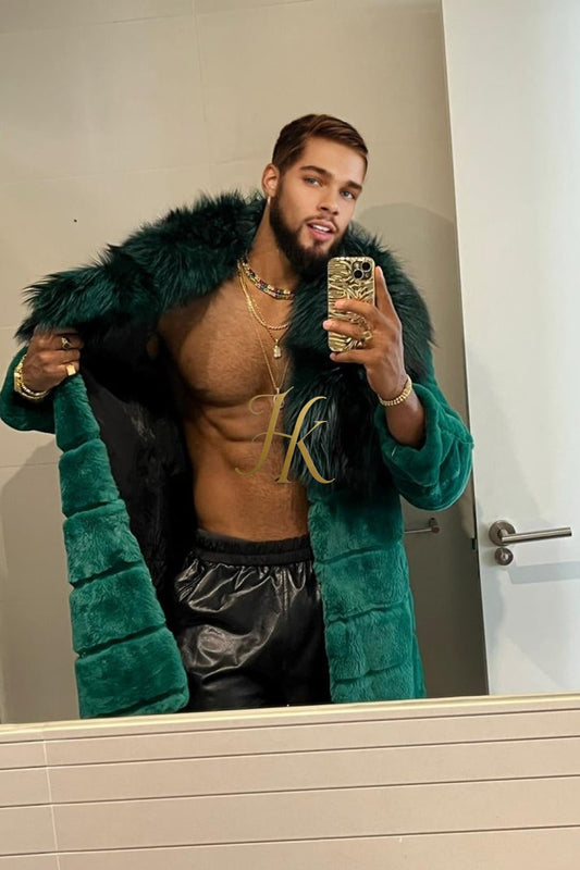 Handmade Luxury Winter Men's Rex Rabbit Fur Coat with Super Large Raccoon Collar - Premium Fashion coat