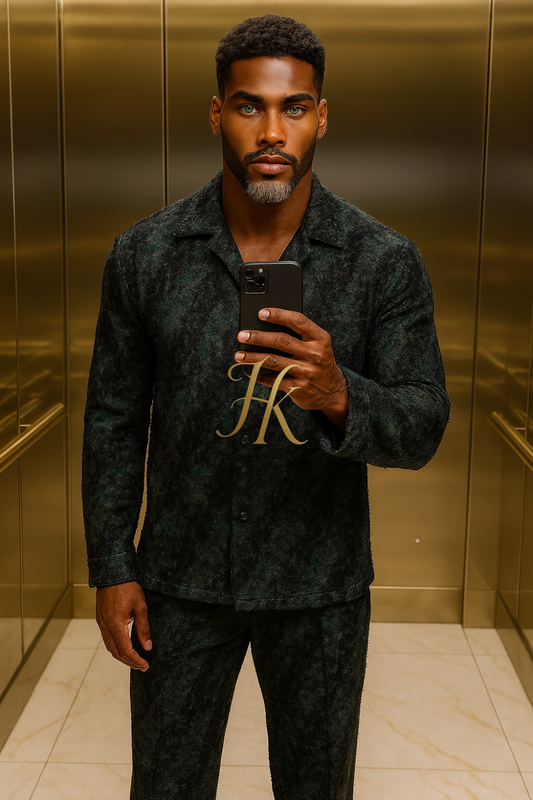 Green Men’s Two-Piece Shirt & Pants Set – Single-Breasted Top with Drawstring Straight Pants