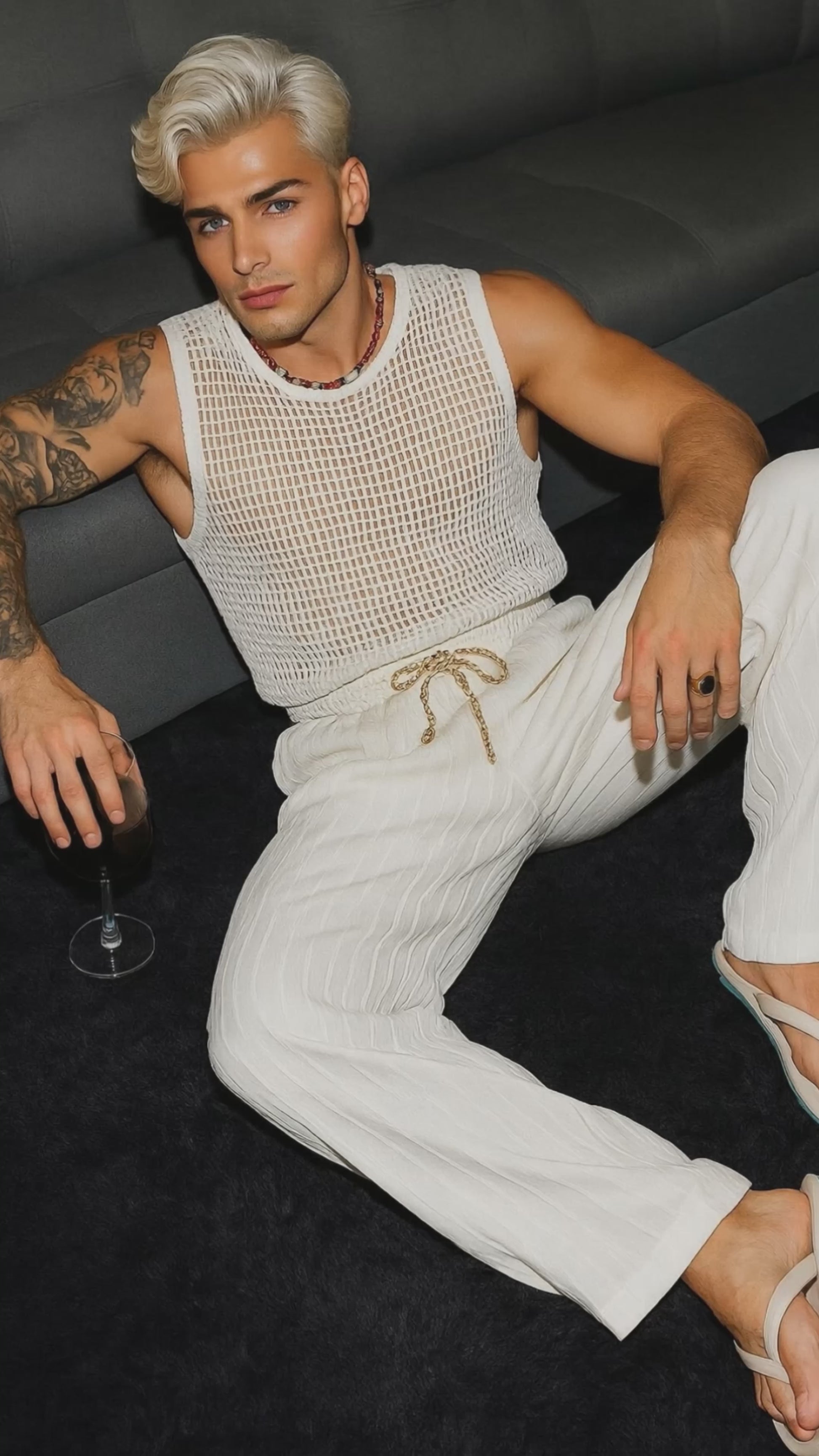 Capture the essence of summer sophistication with this men’s luxury crochet set, featuring a handcrafted cotton tank top and matching trousers. Made from premium breathable cotton, this outfit blends artisanal design with effortless comfort — perfect for warm days and elegant getaways.