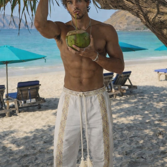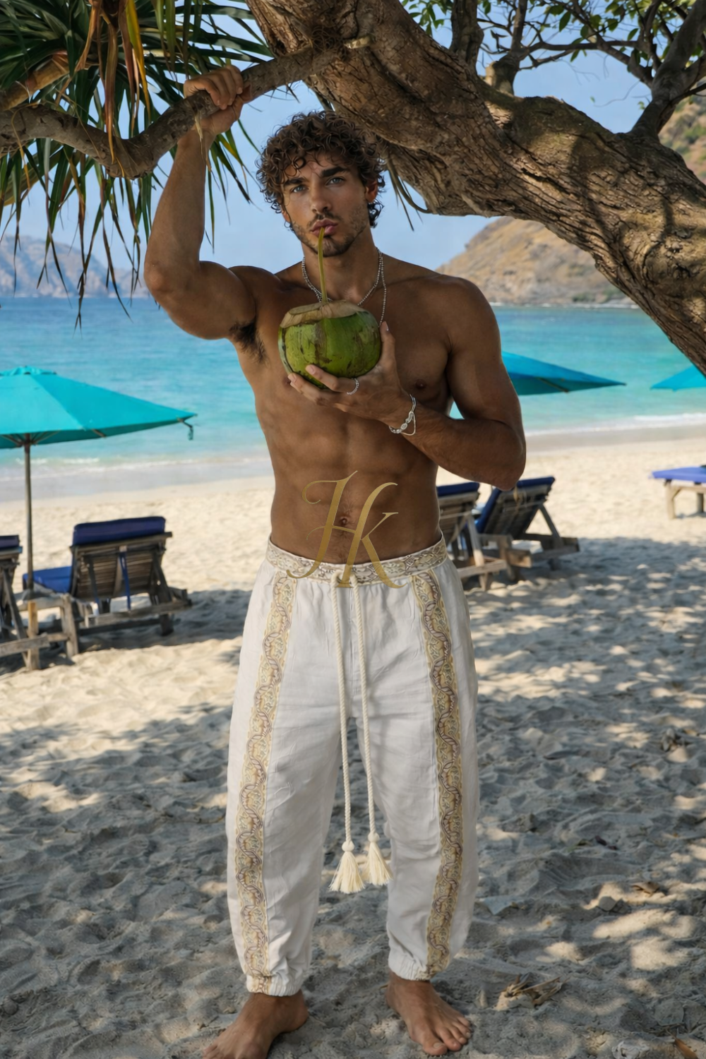 The elongated silhouette enhances the leg line, while the ornamental side panels create a structured, architectural effect. Finished with a twisted drawstring and handcrafted tassels, these pants deliver effortless sophistication with a strong visual identity.