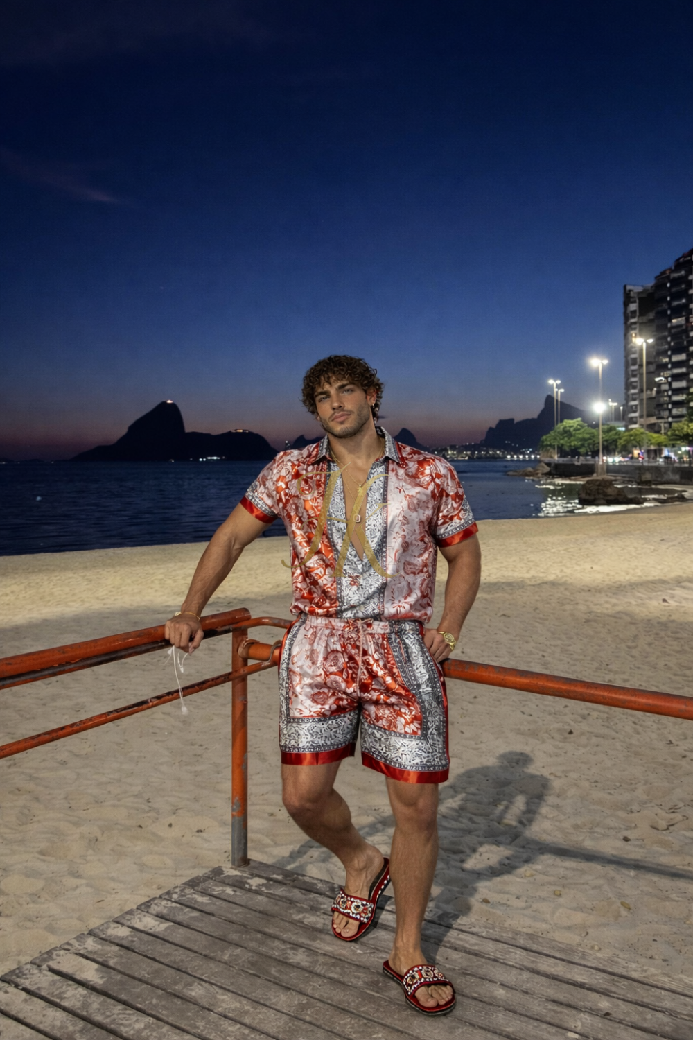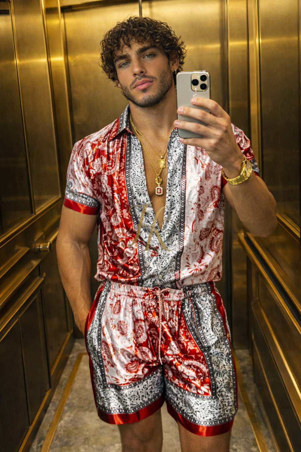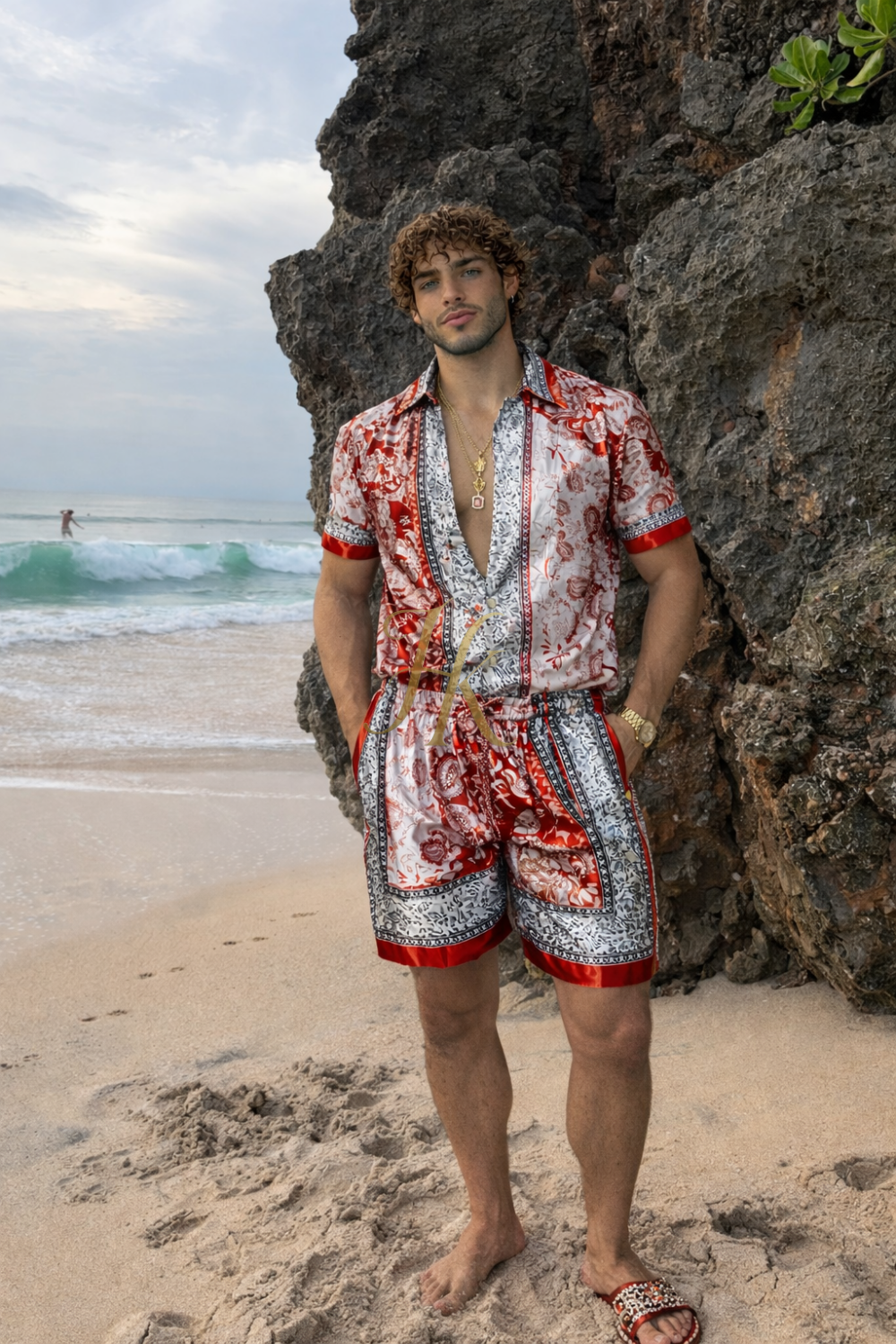 - Made of pure silk and satin, featuring a vibrant Barocco print with a unique-inspired motif at the centre, creating the ultimate luxury summer silk outfit for men.