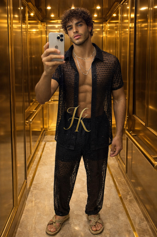 Ultra-Luxury Men’s Set – Silk-Effect Strass Mesh Shirt & Pants