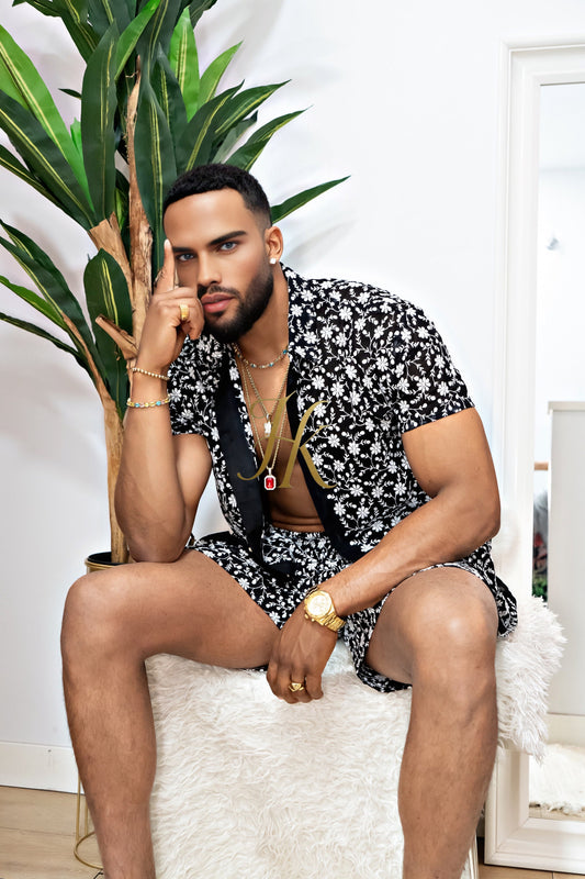 Men’s 2-Piece Set – Shirt & Shorts in Luxury Lace Mesh with Sequin and Beaded Embroidery