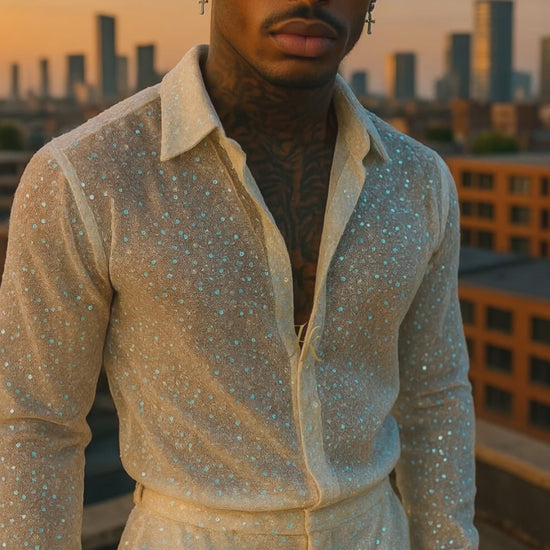 Embrace the essence of high-end luxury fashion with this men’s two-piece embroidered lace set, featuring a long sleeve shirt and matching trousers crafted from superior-quality net lace fabric. Each piece is handmade with precision, showcasing exquisite embroidery, delicate beads, and shimmering sequins that reflect the artistry of couture craftsmanship.