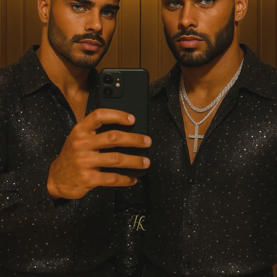 Radiate confidence and sophistication with this luxury men’s outfit set, crafted from super-density silver glitter net fabric featuring a hot diamond spray and foil stamping finish. Designed for men who appreciate glamour and refinement, this two-piece ensemble — a long sleeve shirt and matching trousers — brings together modern brilliance and couture-inspired craftsmanship.