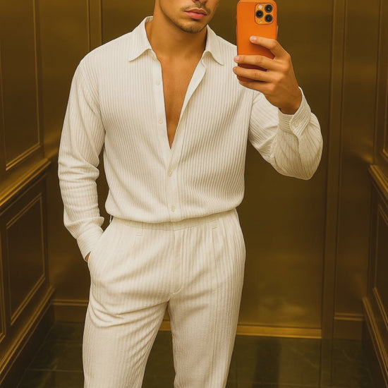 Men’s Thin Knit Two-Piece Set – Solid Color Sexy Shirt & Pants Casual Fashion Outfit