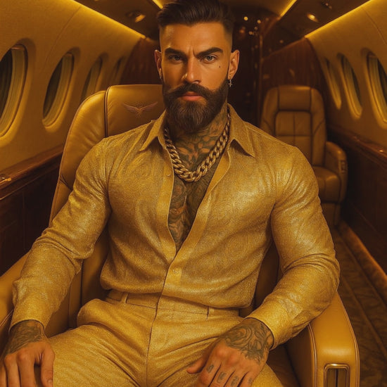 Radiate confidence and sophistication with this luxury men’s outfit set, crafted from super-density gold glitter net fabric featuring a hot diamond spray and foil stamping finish. Designed for men who appreciate glamour and refinement, this two-piece ensemble — a long sleeve shirt and matching trousers — brings together modern brilliance and couture-inspired craftsmanship.