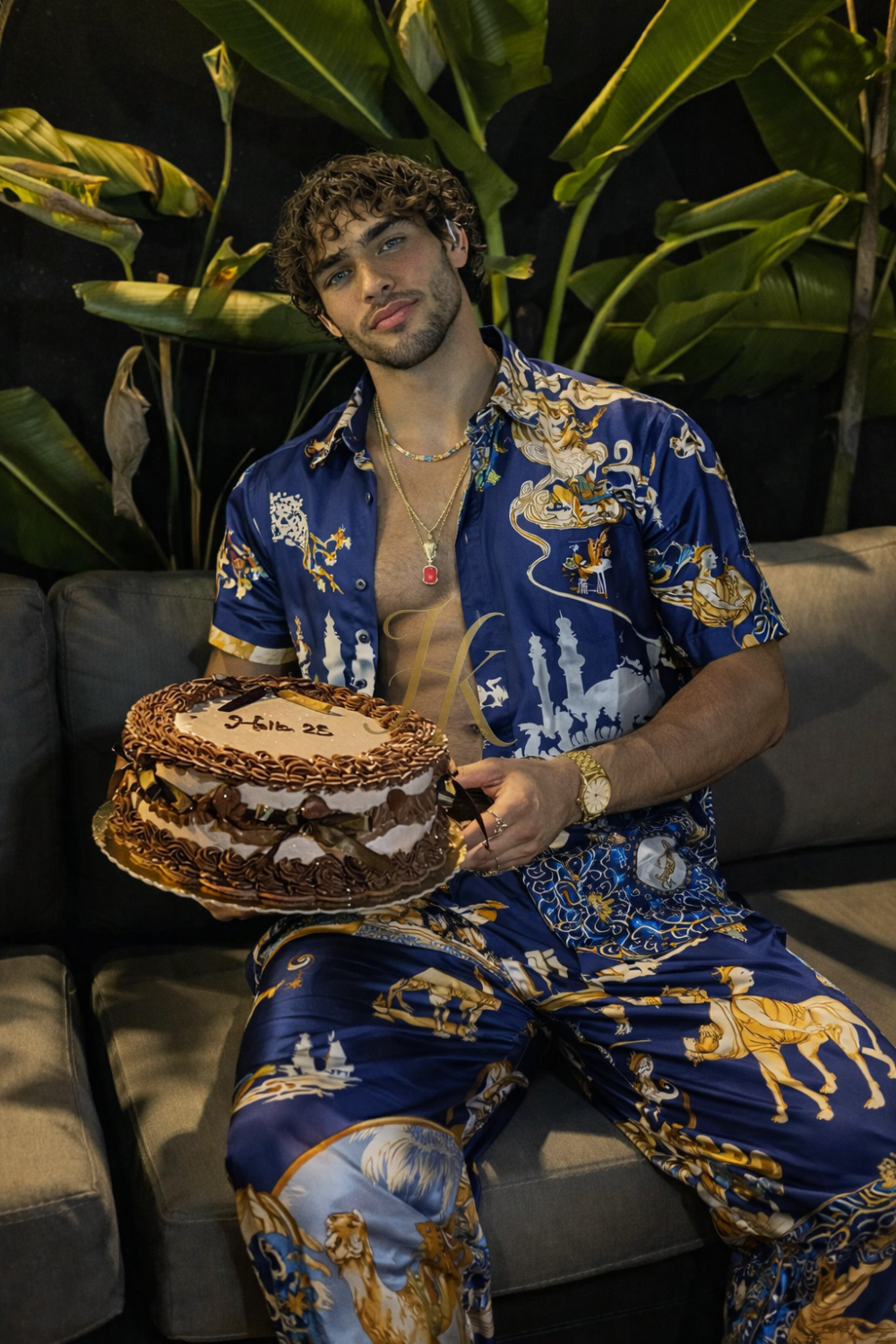 The relaxed silk shirt drapes effortlessly, opening naturally at the chest for a sensual yet controlled silhouette. The wide-leg trousers balance structure and fluidity, offering supreme comfort while maintaining a commanding presence.